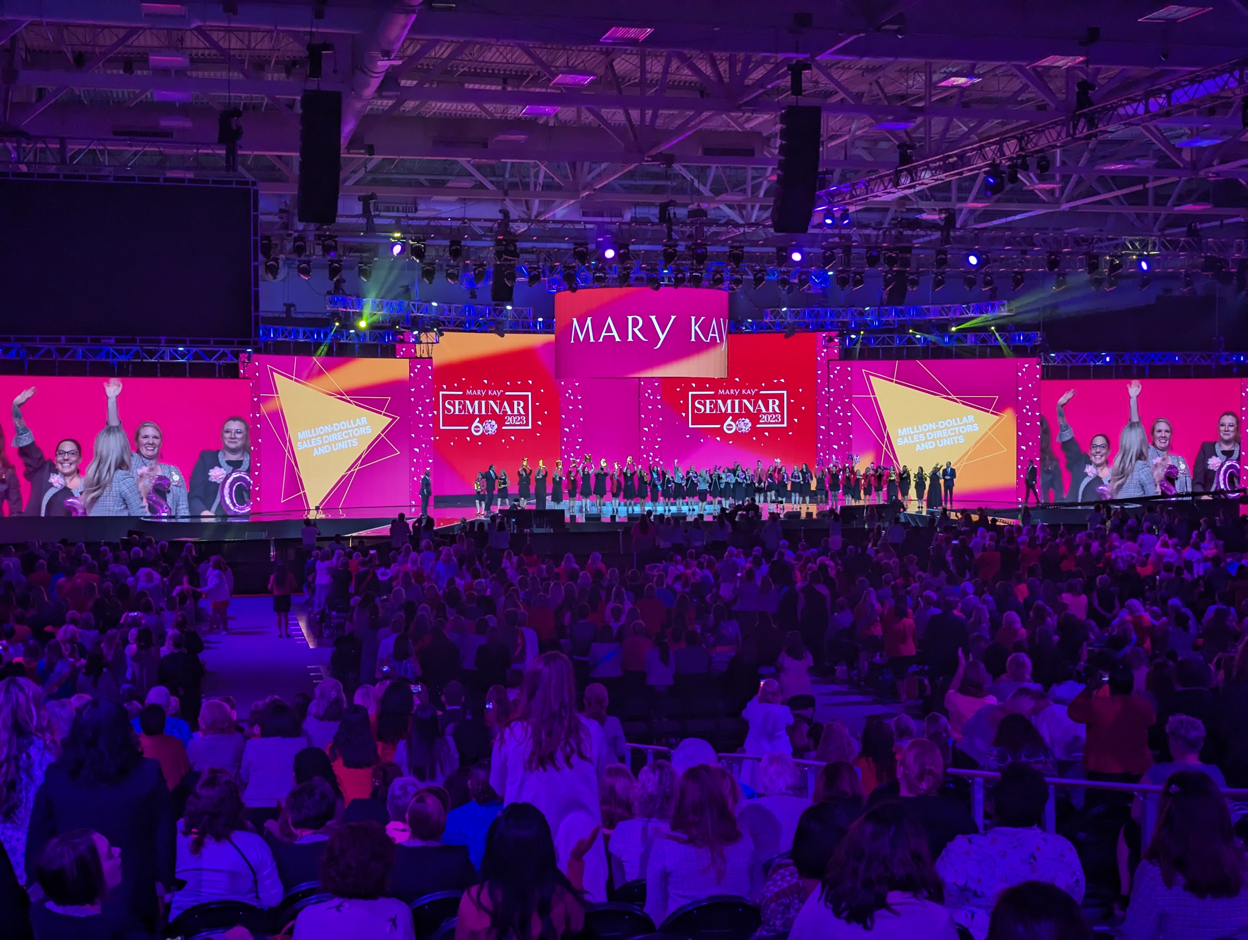 This custom stage and video wall layout is one of our most favorite events! There are several layered video displays as well as a flown, round video wall in the center of the room.