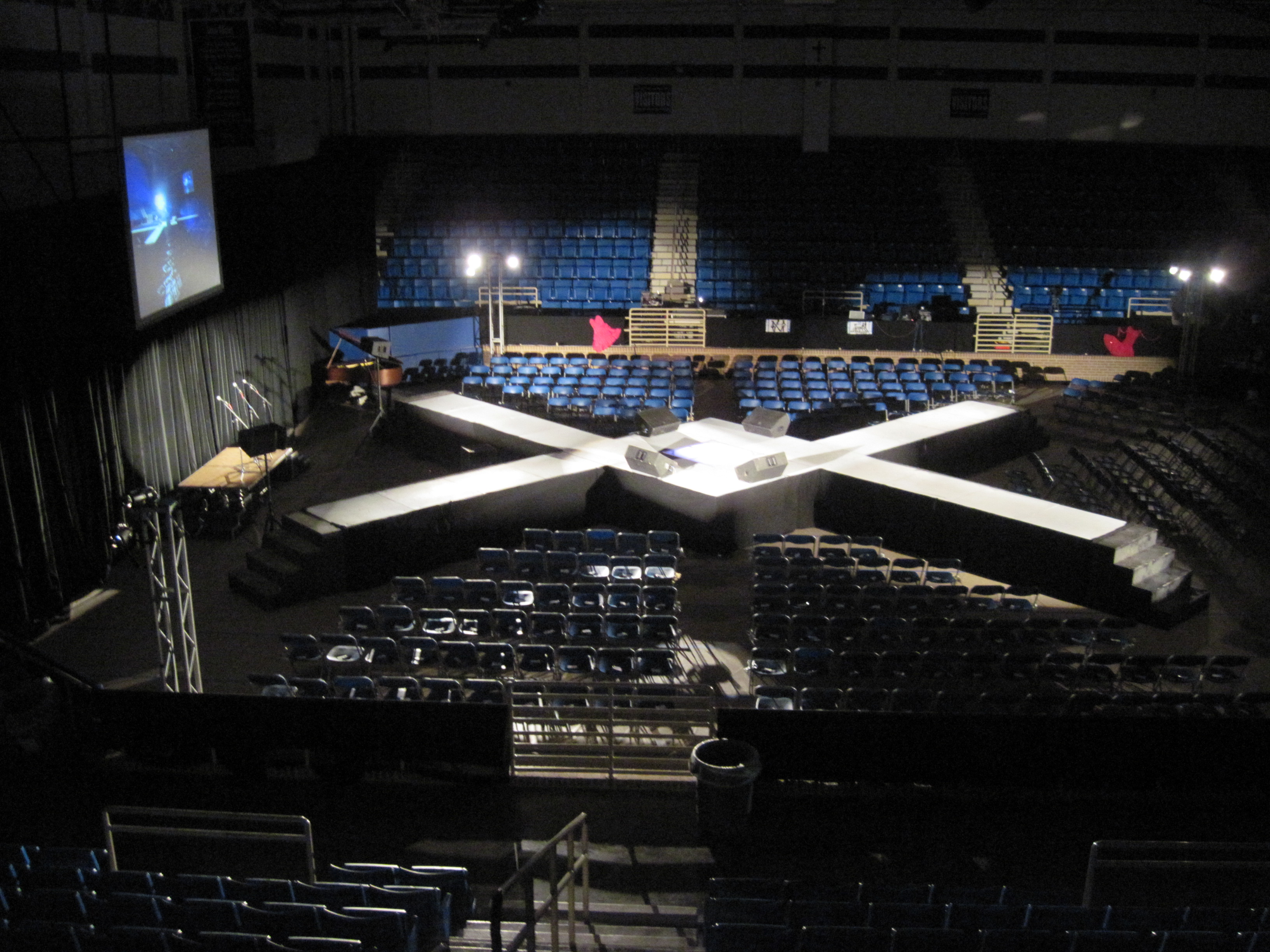 This is a four way catwalk / fashion runway stage. We can do some really interesting designs and build custom stair cases also. This stage's top surface is a white carpet and the sides and steps are black skirted, making the top really stand out with for the back row guests.