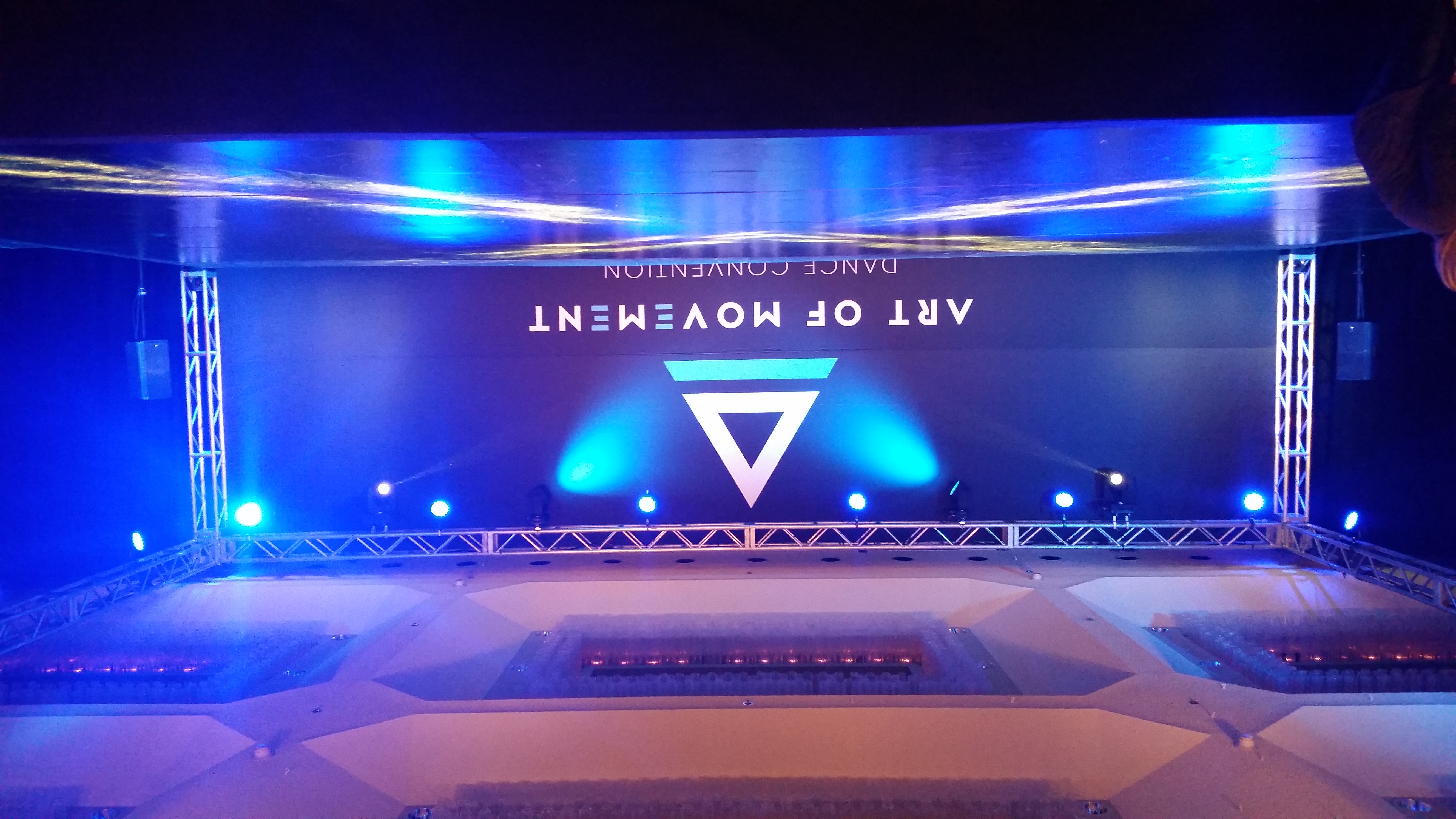 This stage was built for a dance competition and made use of a box truss structure for surround moving lights and flood light color shifting. We also provide audio packages with engineers for this type of event.