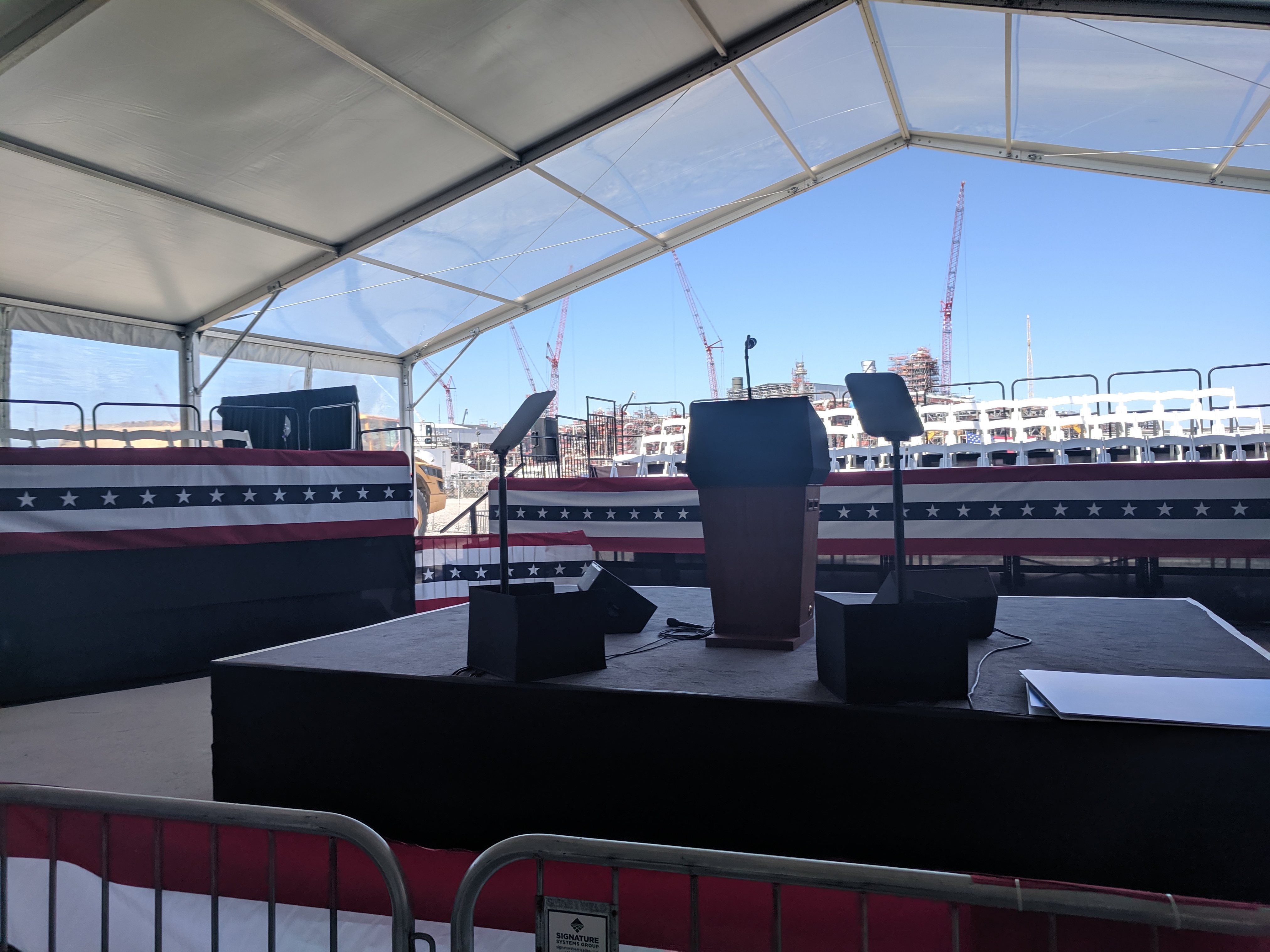 This rental stage was built under a clear span tent for a presidential event. The setup included bunting and seating risers behind the main stage.