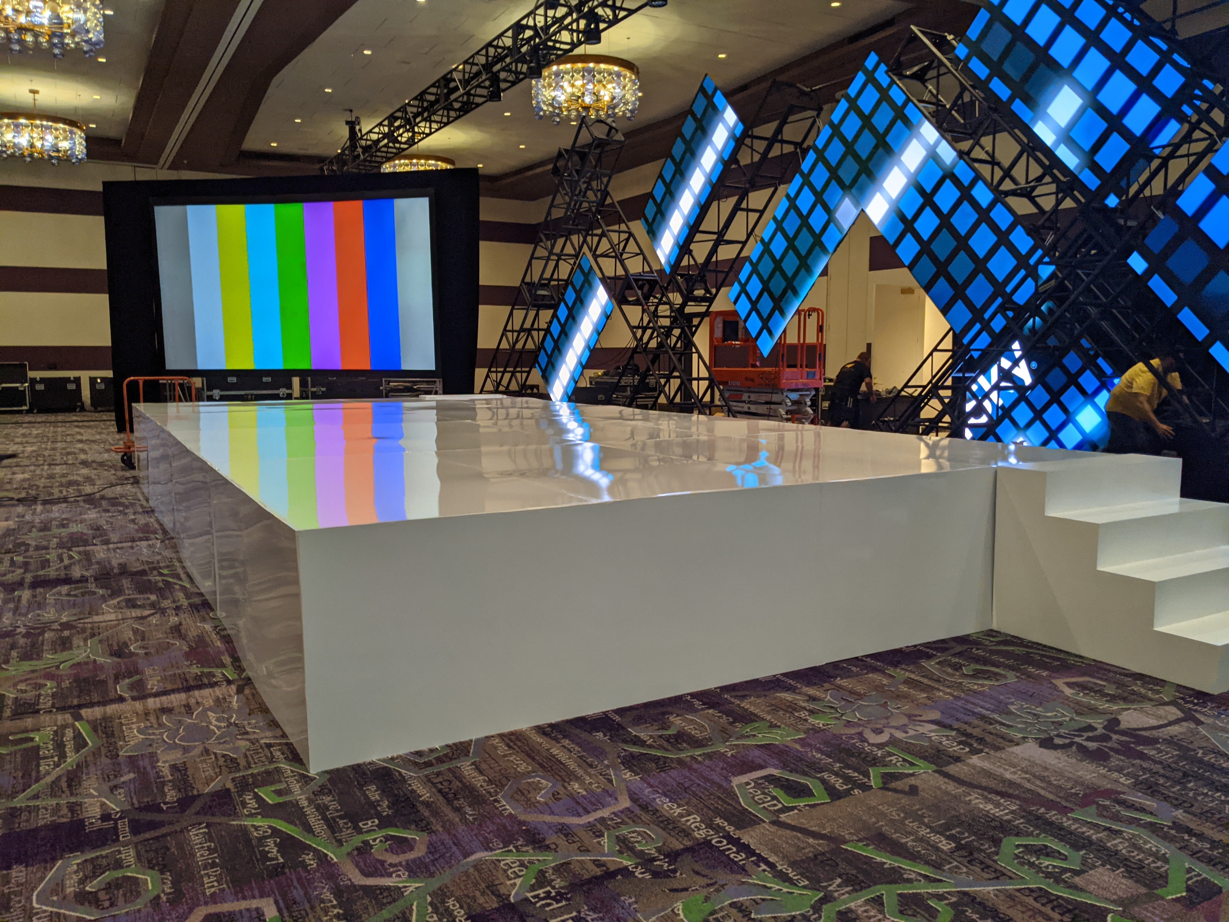 This is a custom build stage with a smooth Marlite surface all the way around. Our carpenters built it on site at the convention center plus you may notice our custom designed LED facade with a ground support LED Wall in the background.