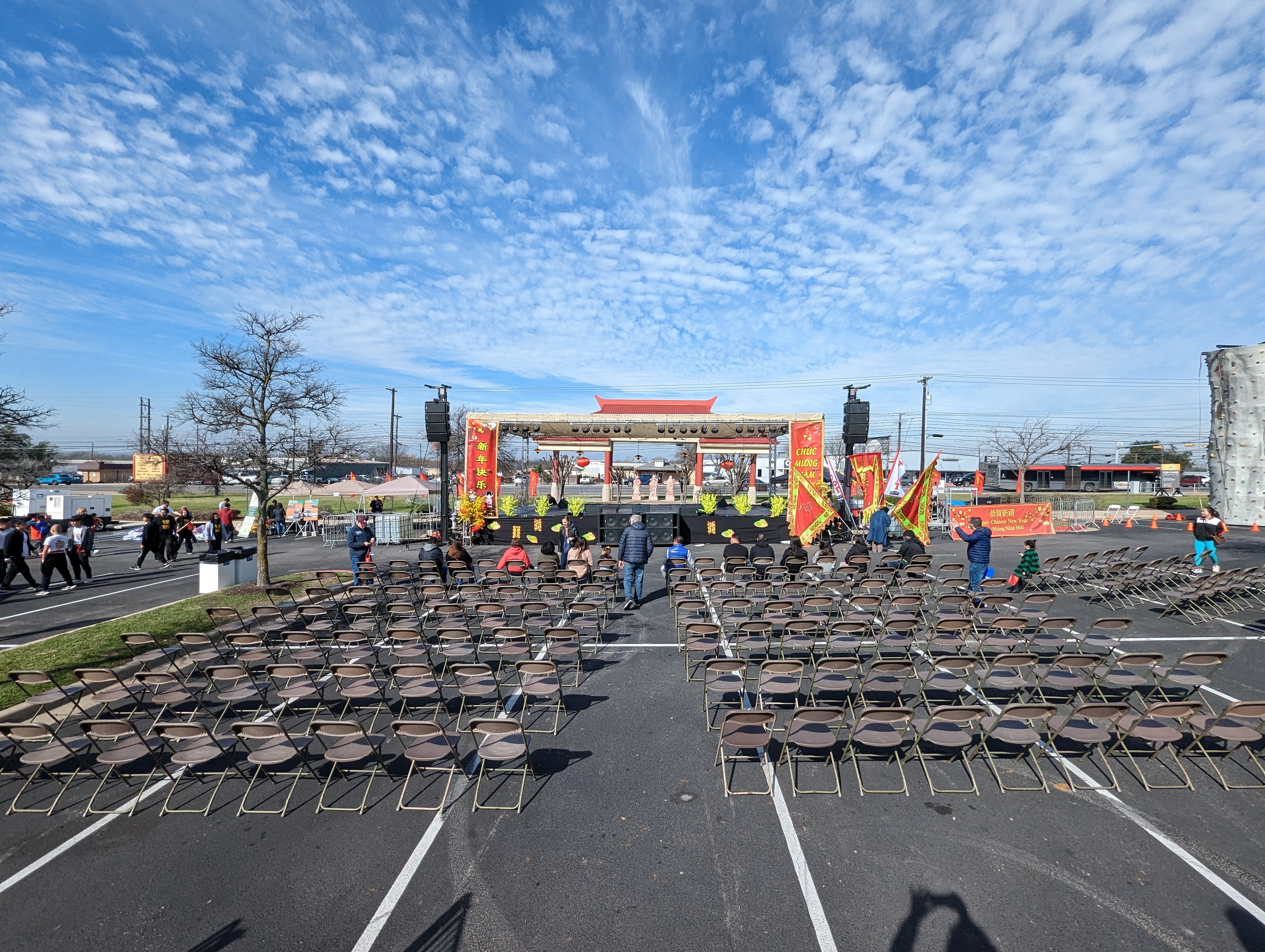 32x24 shade roof and stage rental with production mall chinese new year. We set up along with bringing a full production service with banner covered crowd barricades.
