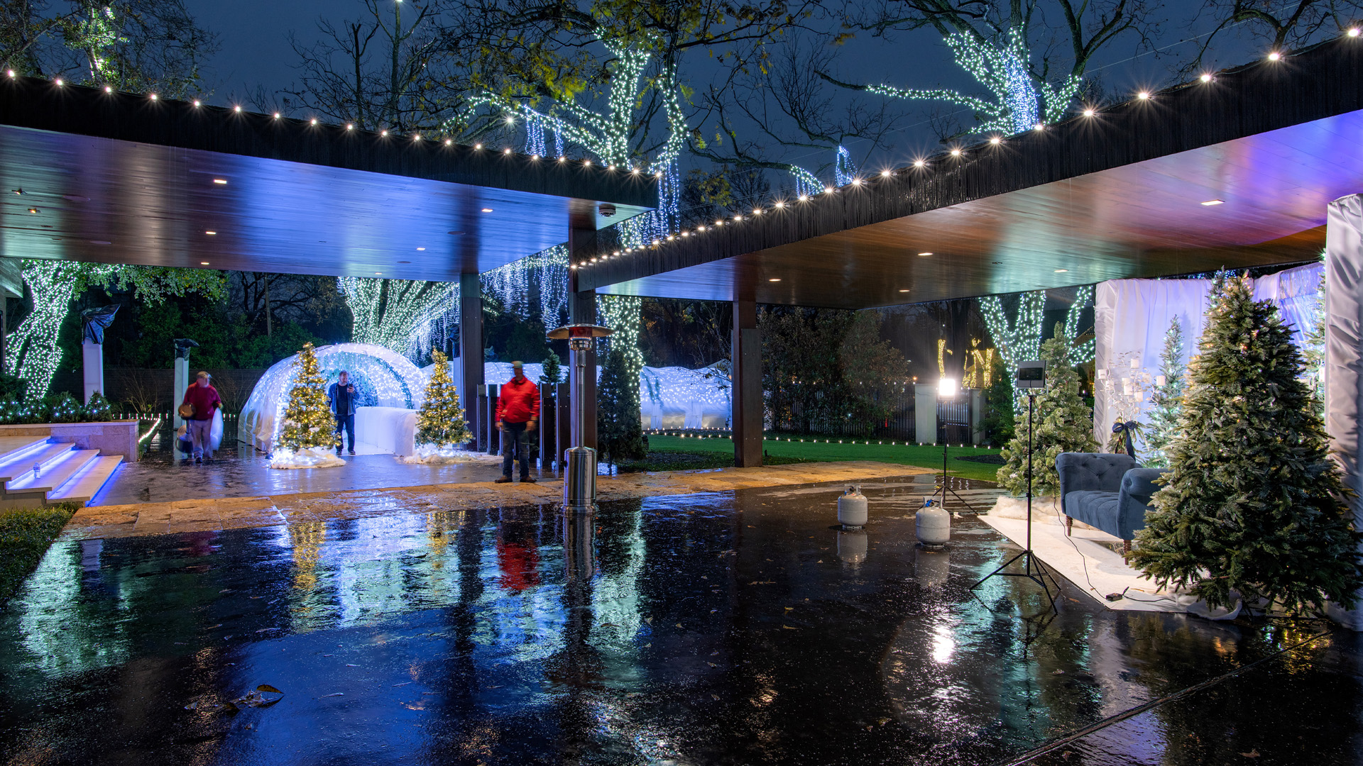 This private home has a blowout Christmas party for family and friends. A lit tunnel for entry and a custom step and repeat greet guests at this event.