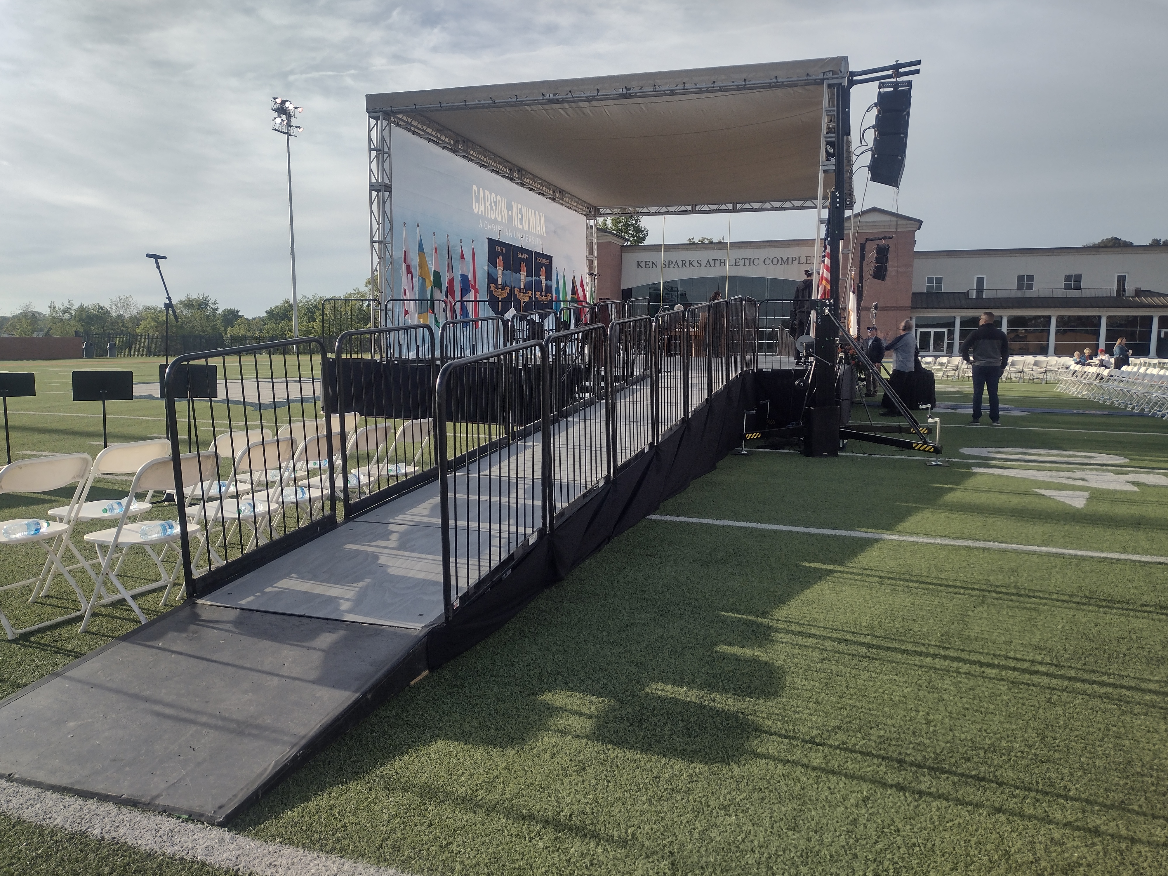 For this outdoor event we set up this ADA Ramp along with our 32' x 24' shade roof stage. This is a musical concert event with a full audio array and a custom printed backdrop.