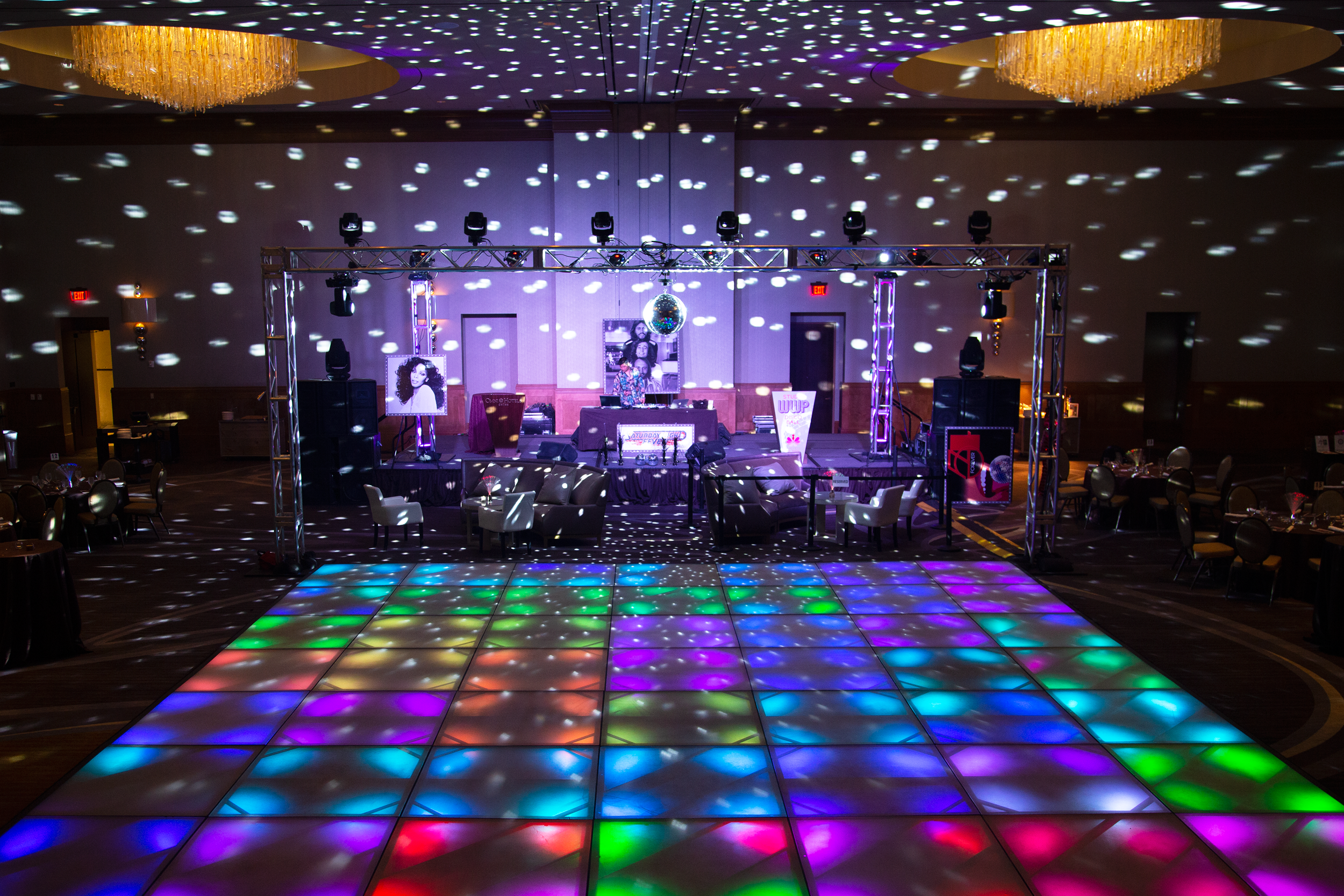 This dance event was held in a hotel ballroom and we used a very bright directed spot light to cast mirror ball reflections around the room in every direction. By using a box truss system we were able to put most of the tech and gear up in the air clearing out space for a huge LED Dance Floor that could fit over one hundred dancers at the same time.