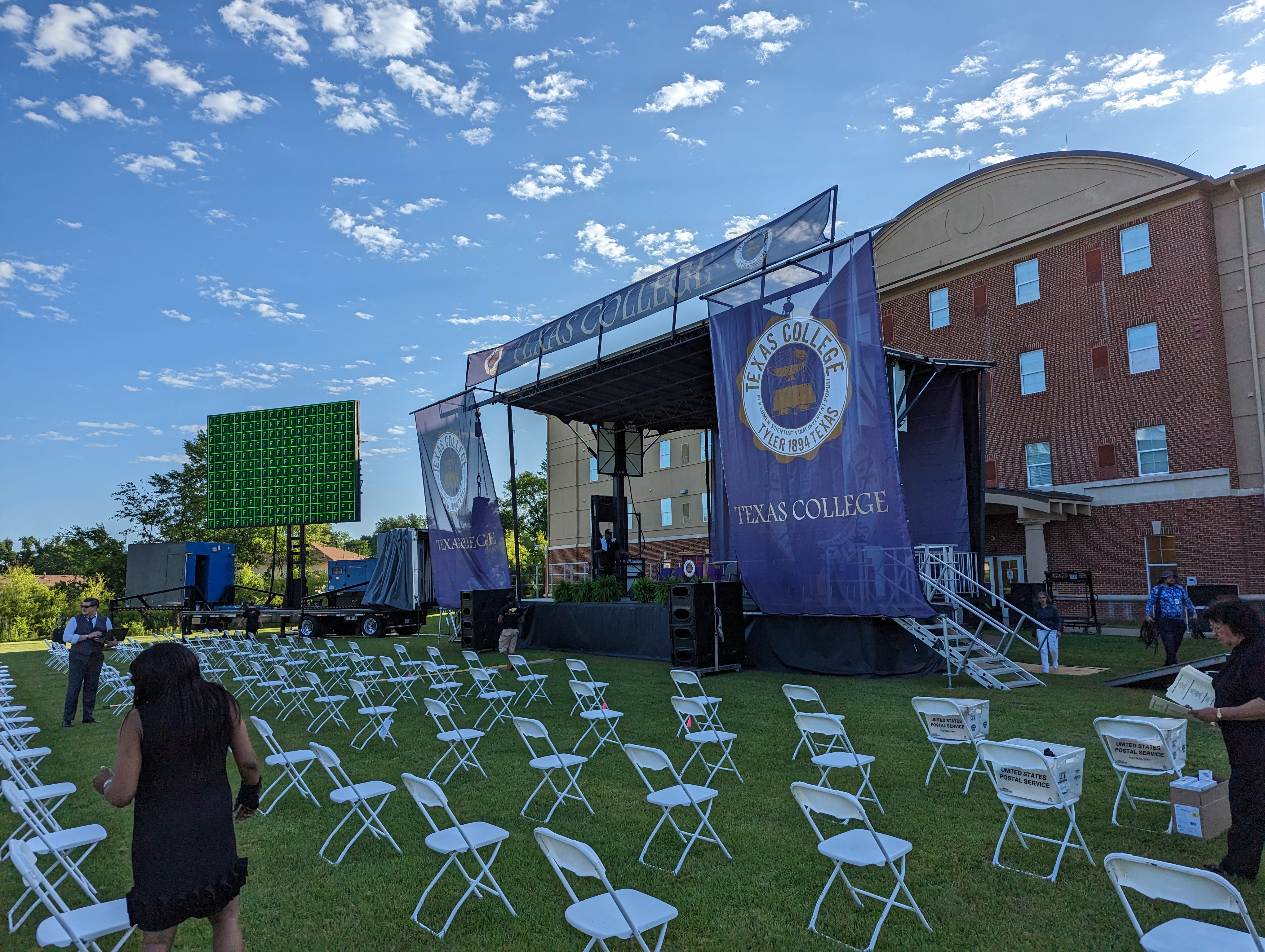 This stage is an SL250 mobile unit with a separate video wall trailer. We also provided the chairs, print services, a choir riser, and full Audio Production at this graduation.