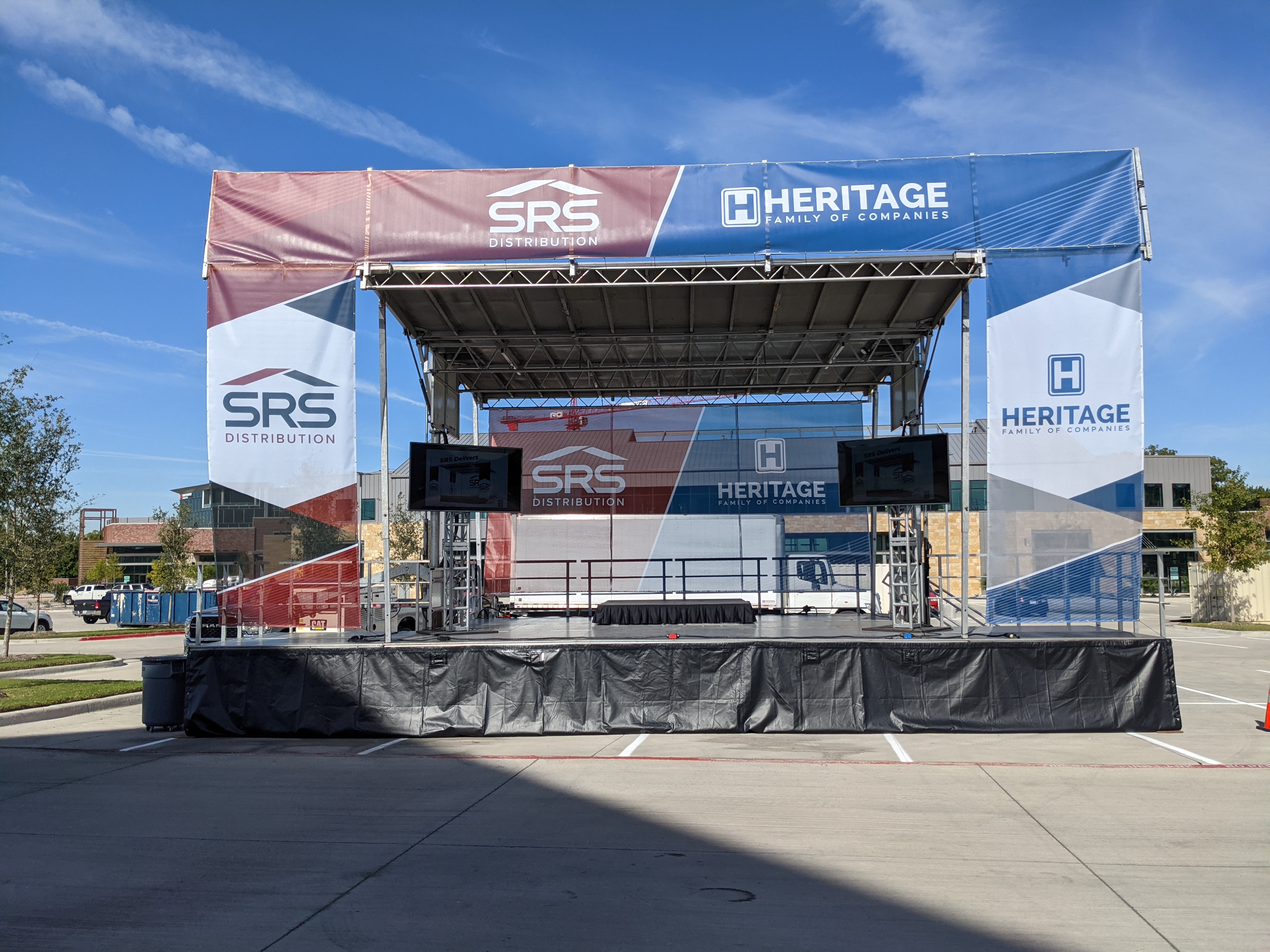 On this stage we really wanted to get people's attention from far off. A full banner package of custom prints spans the stage wings an overhead. You can't help but notice this is the main attraction.
