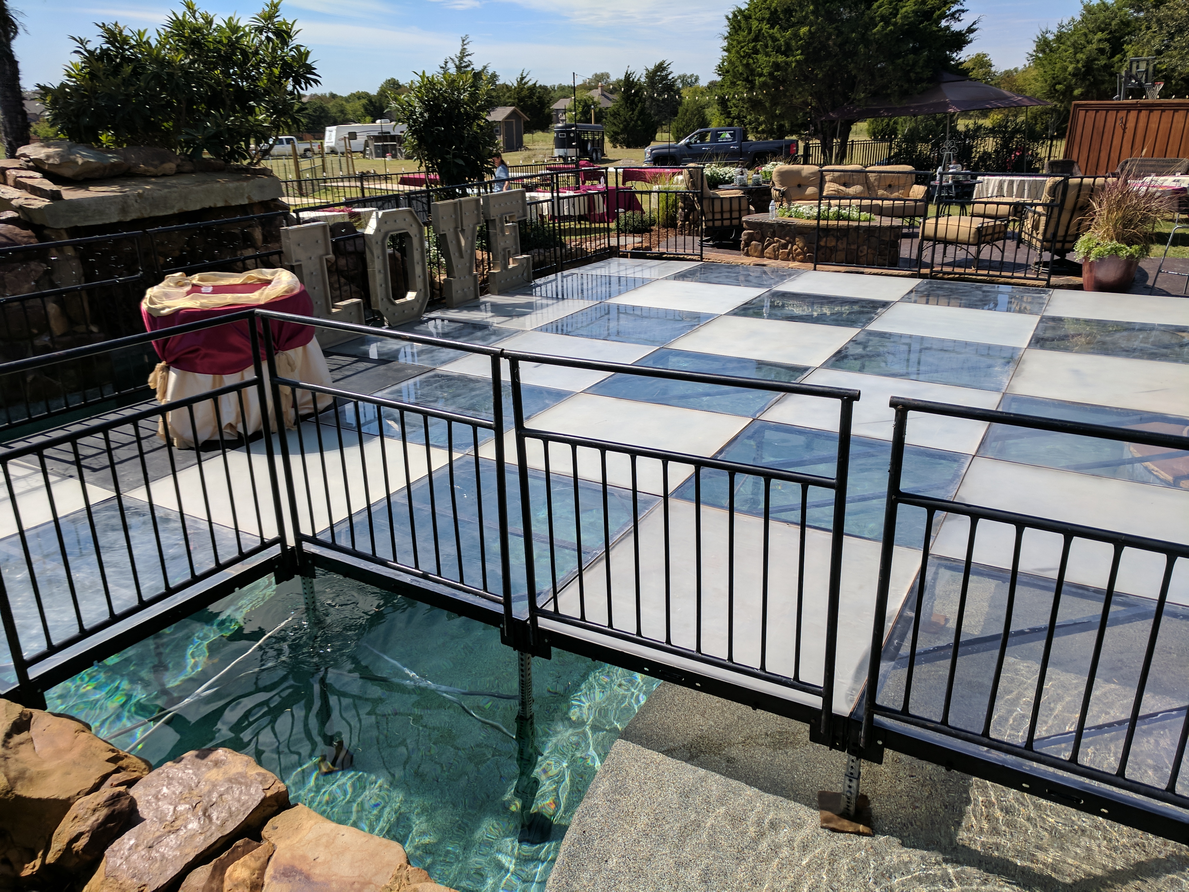 For this unique pool we worked around many rocks and stone features to make a dance floor. We used both Clear acrylic and Frosted acrylic in a checker pattern. Our rope lights illuminated the water more than the dance floor.