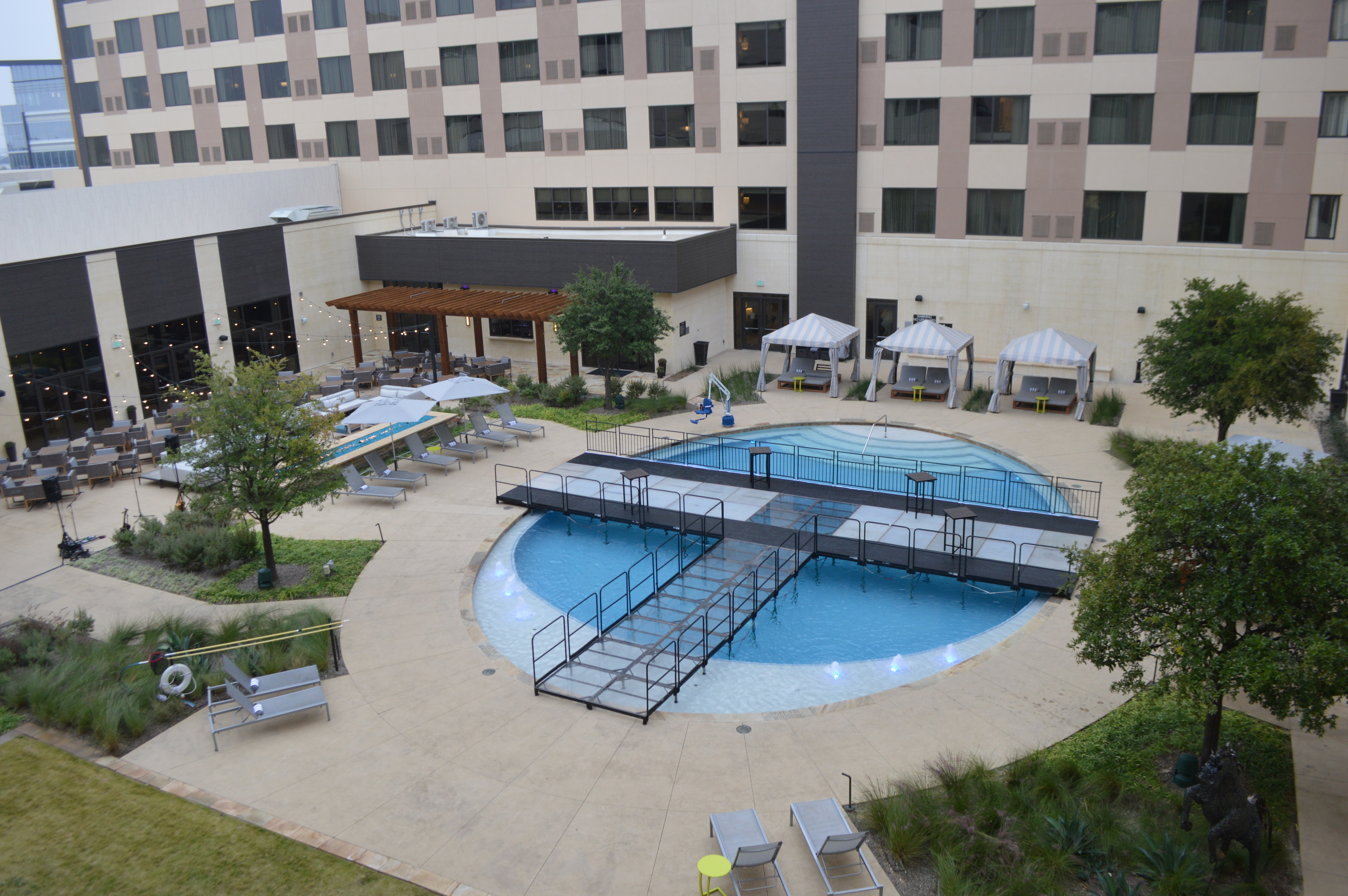 At this Hotel Wedding our team covered the Swimming Pool with a cover using a style designed by the wedding planner. Materials were mixed from all three of our over water materials; Black Utility, Frosted and Clear Acrylics.