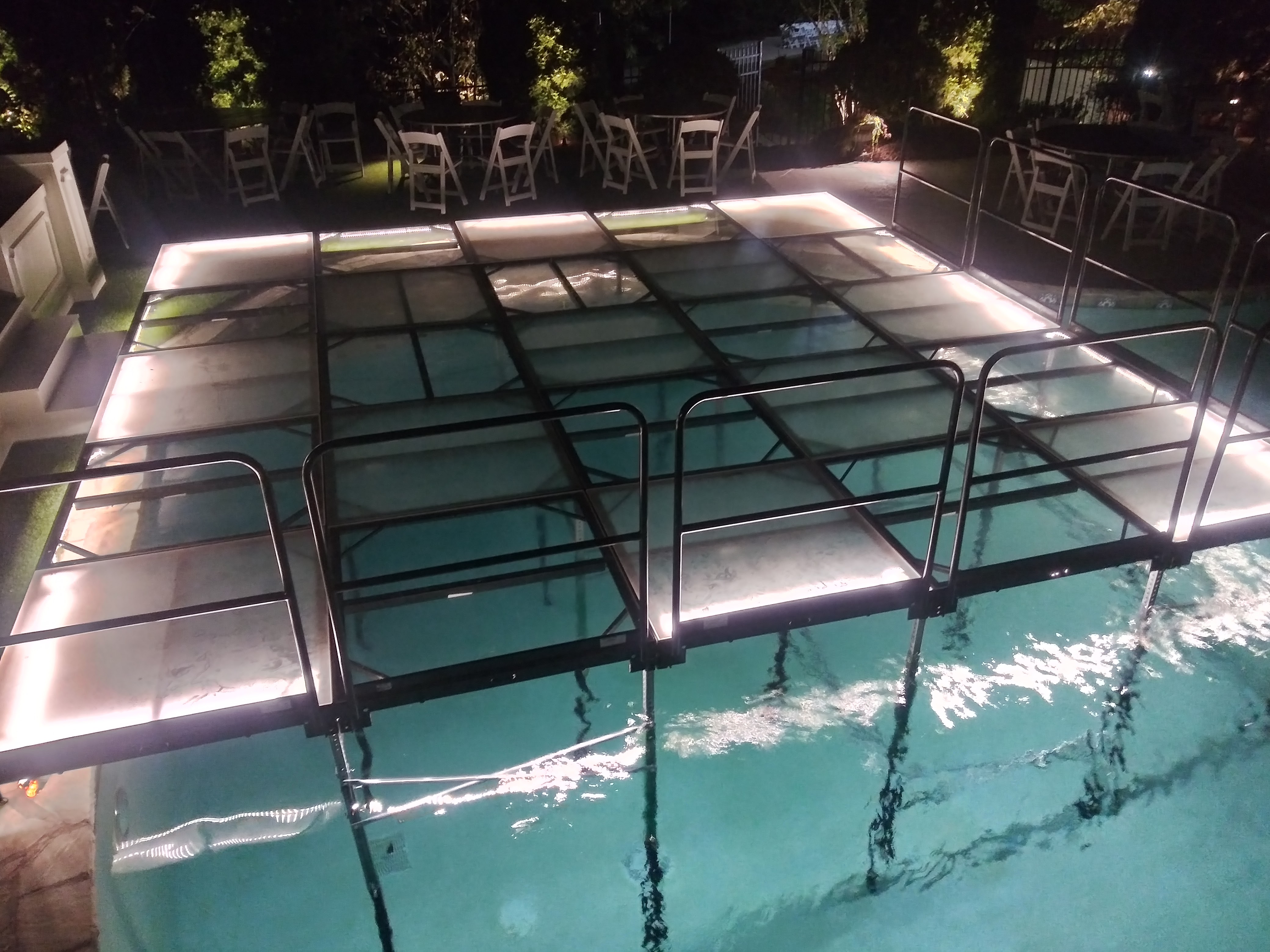 For this dance floor we used both Clear acrylic and Frosted acrylic in a checker pattern. Our rope lights illuminated the water more than the dance floor.