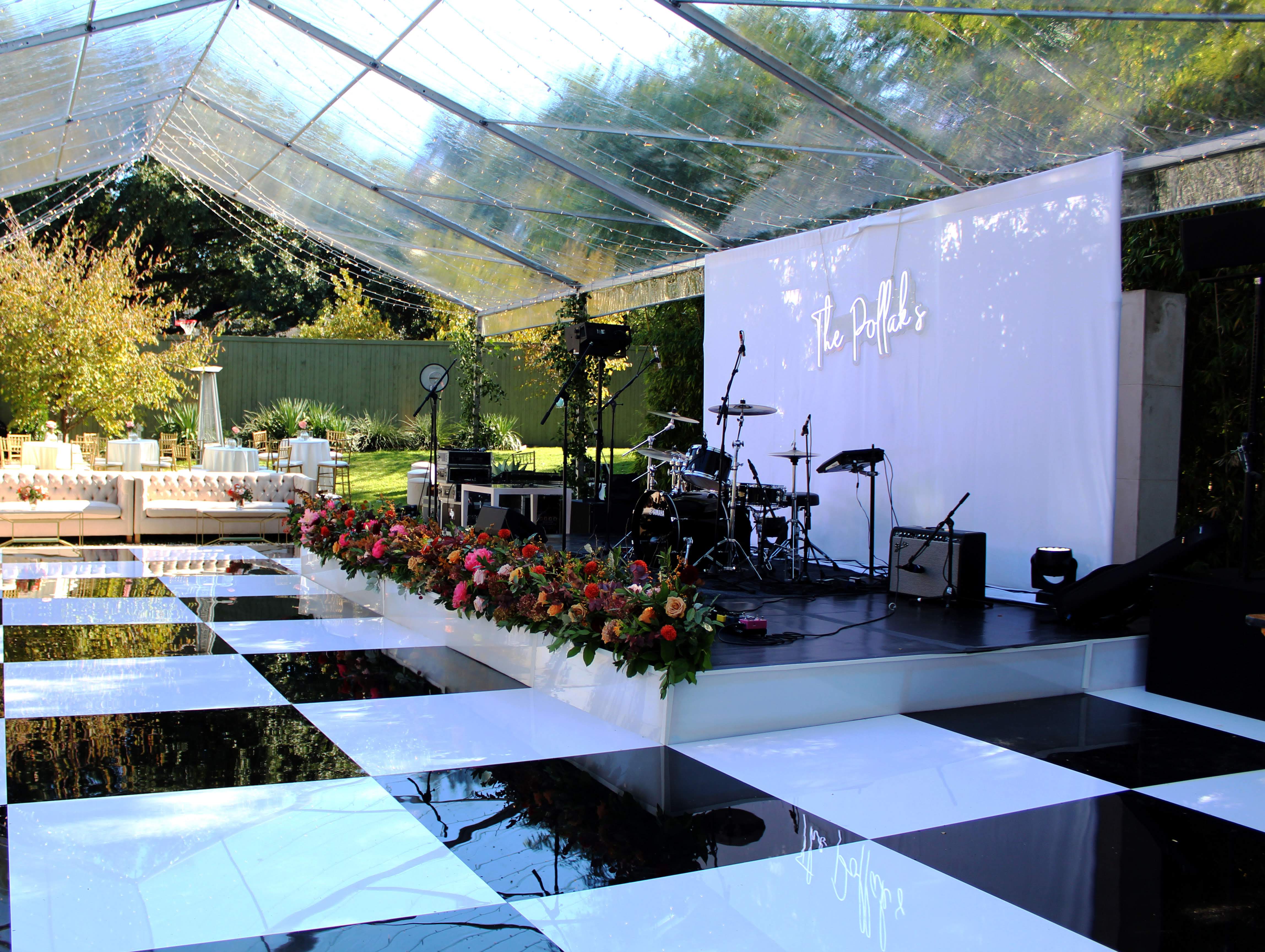 This is a Utility Pool Cover with a high gloss checkerboard acrylic dance floor on top of it. Underneath this band stage is a normal family swimming pool. After that was built we also installed a Clear span tent with a clear tent skin.