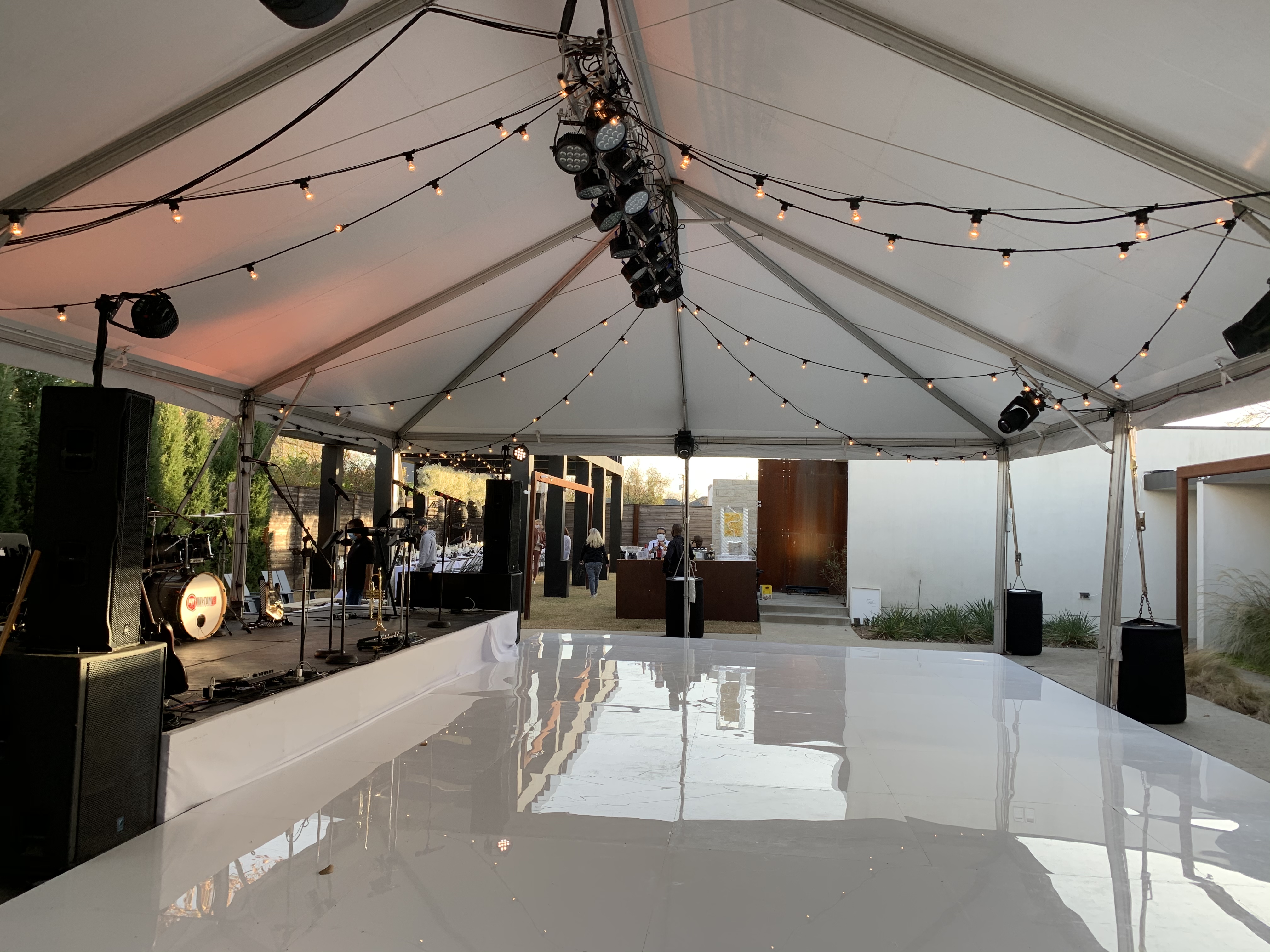 This is a Utility Pool Cover with a White high gloss acrylic dance floor on top of it. Underneath this band stage is a normal family swimming pool. After that was built we also installed a Clear span tent with an opaque white tent skin for summer shade.