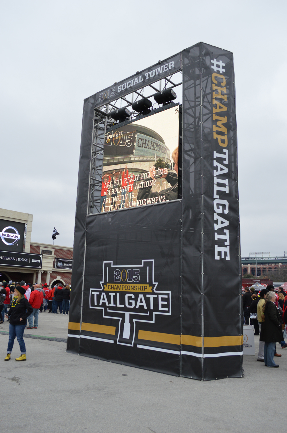 This vertical engineered tower was used at a sporting event to supply announcement PA and Video