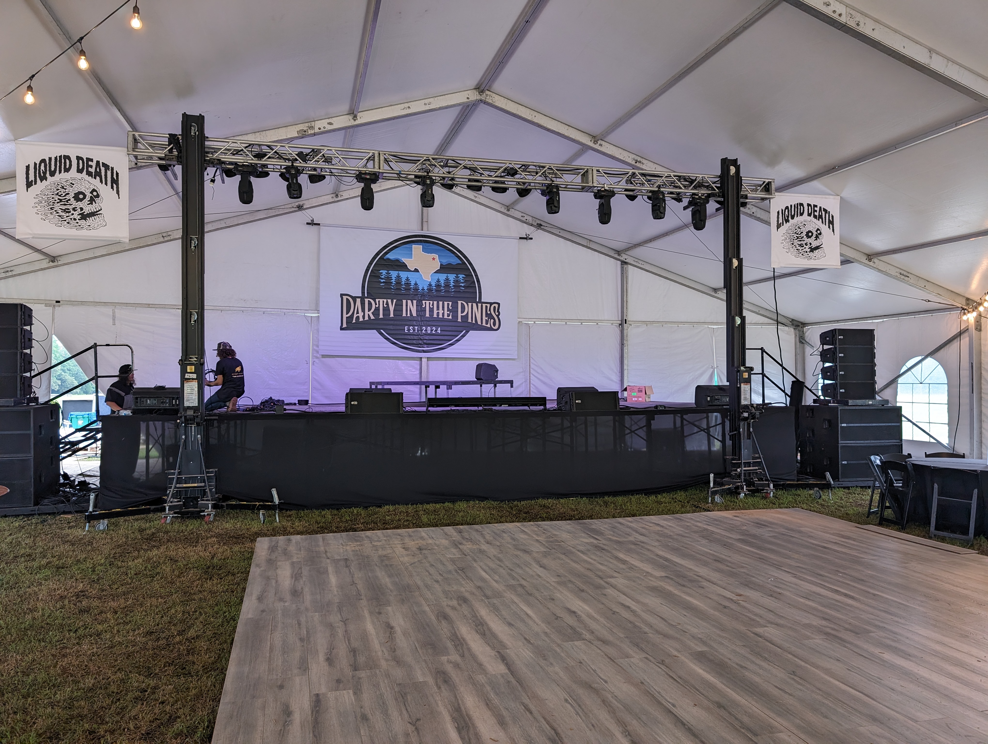 This was a full production everything event. We brought audio, stage, lighting, several tents, a dance floor, and all of the labor to make the party a winner.