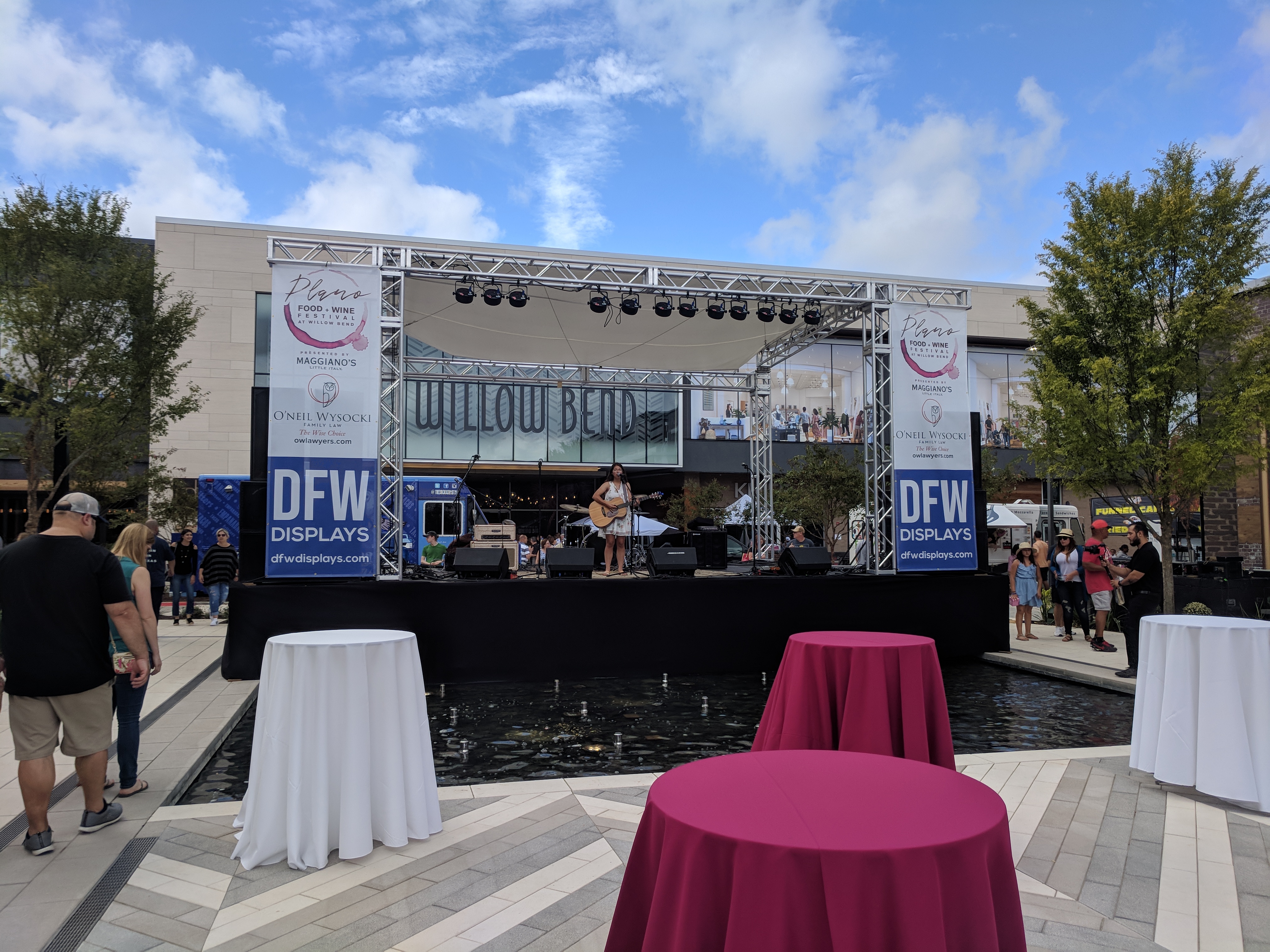 This 24'x20' stage with shade roof included lighting and audio rental for an elegant marketing event. Banners and location made for a remarkable setup for attendees!
