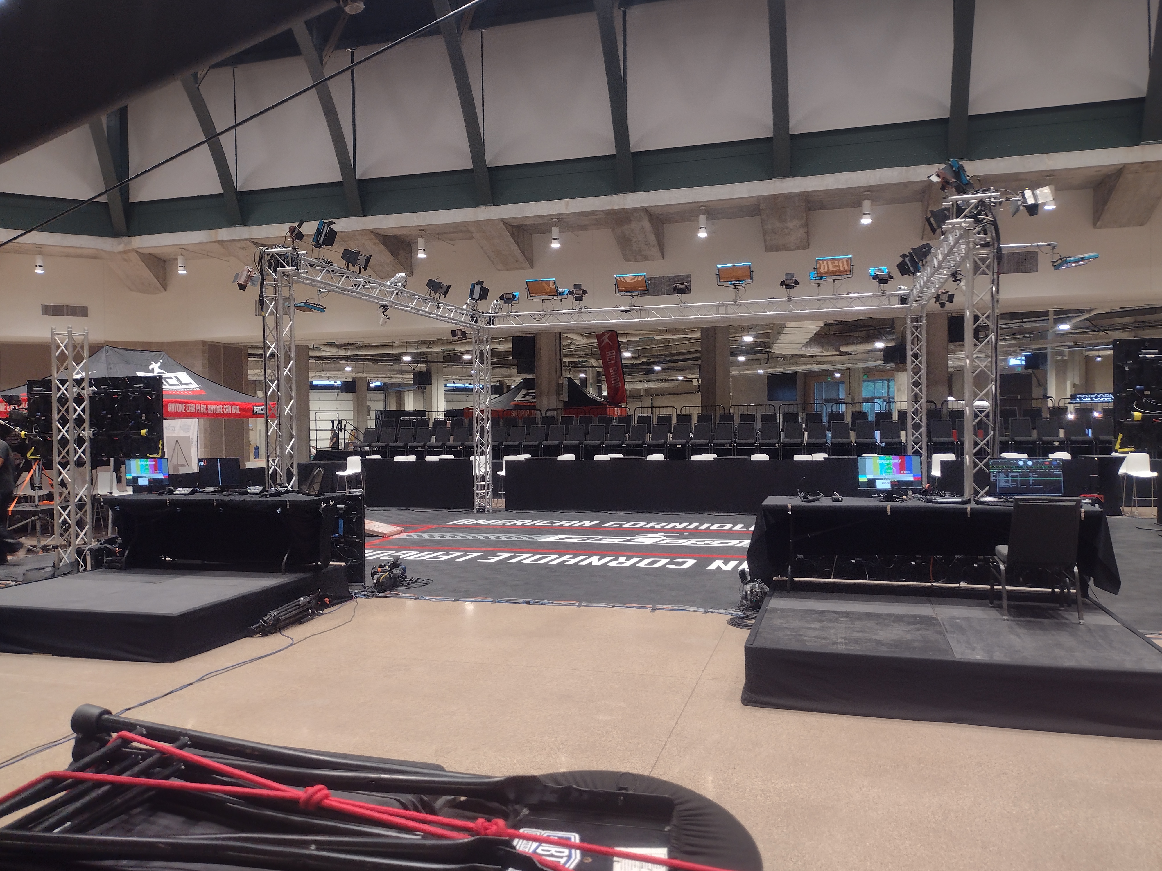 Special truss arrangement with lighting and a seating riser.