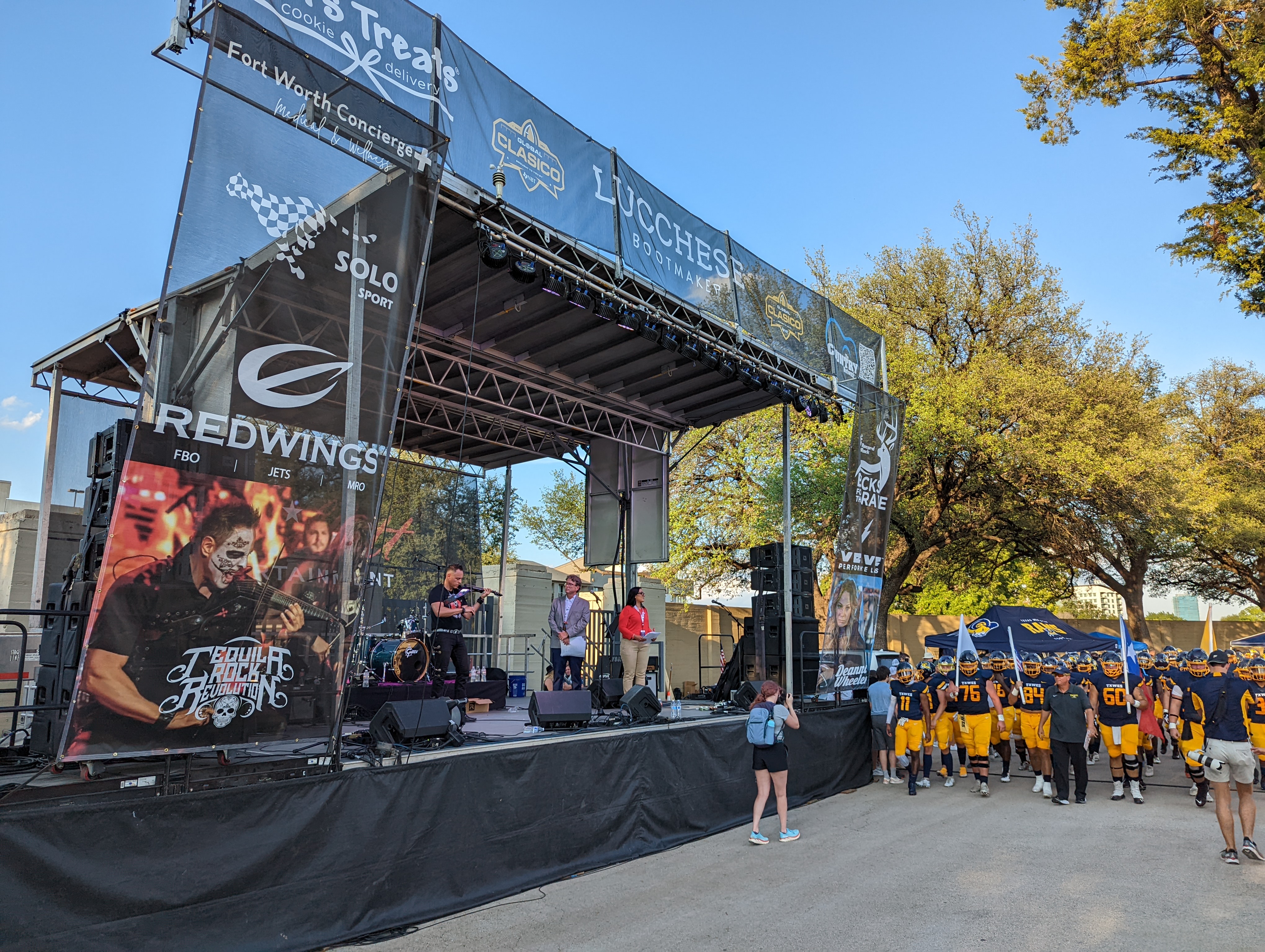 Football season promotional concert with a mobile stage.