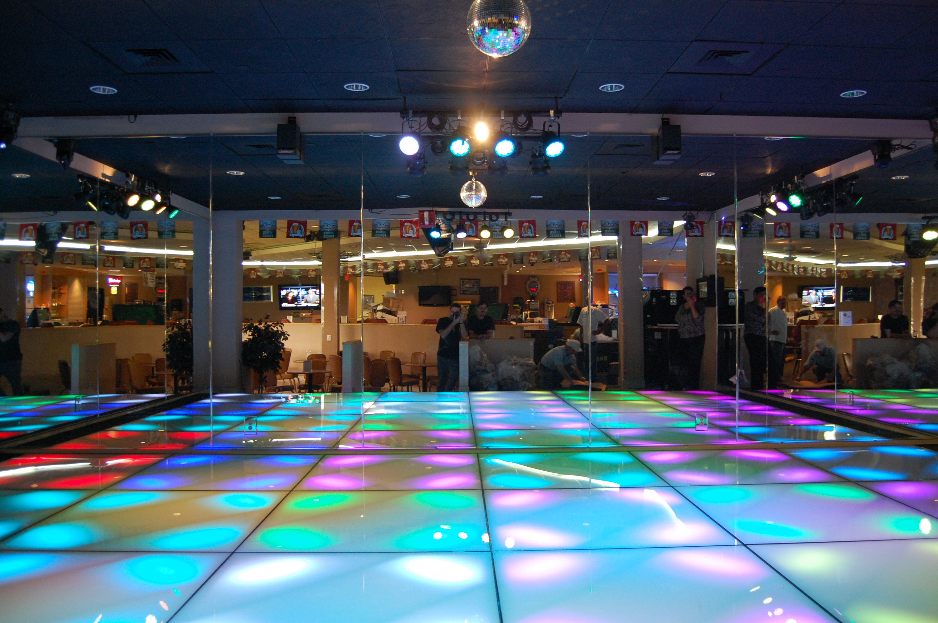 A mirrored wall enclosure makes this LED Dance Floor feel like the crowd of a dozen becomes hundreds.