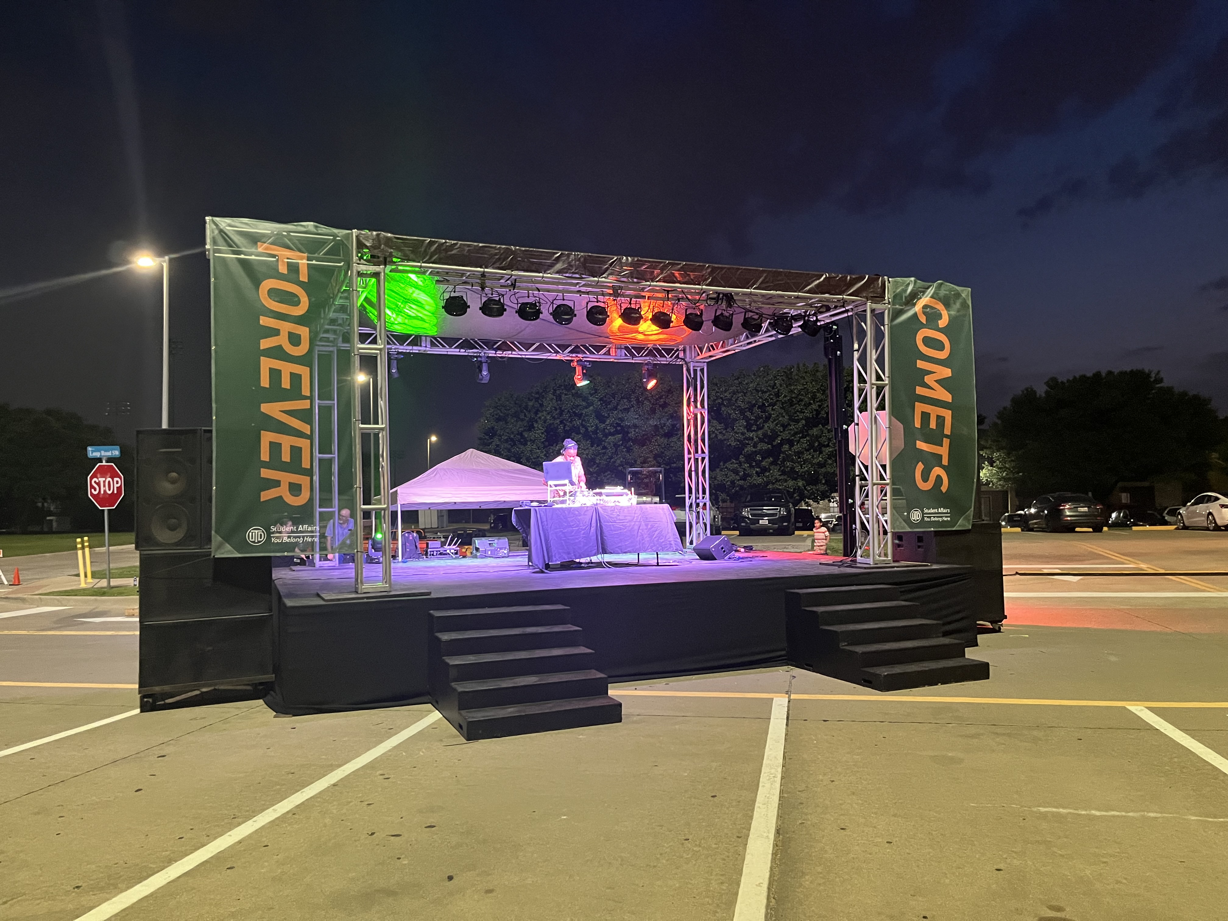 This stage with custom banners, lighting, and audio is used for an annual collegiate post-graduation party.