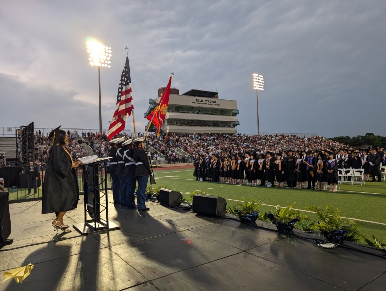 This stadium commencements is a four day rental, with multiple ceremonies for different schools in the district. A key placement is IMAG on three LED video walls.