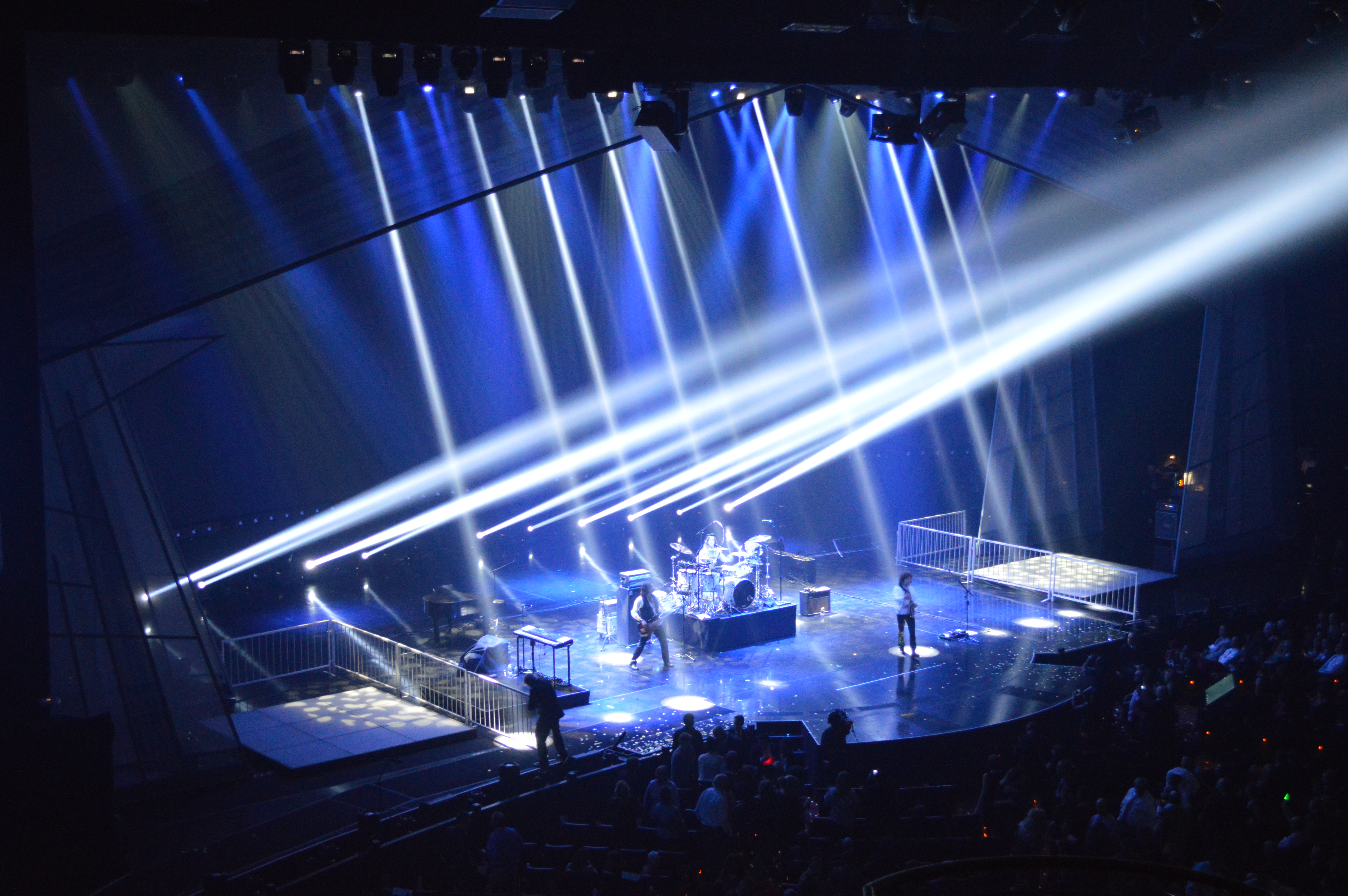 Beam or Spot lights work best with a light haze in the air. We gently fogged the room from high up in the ceiling to get a powerful beam effect during the concert.