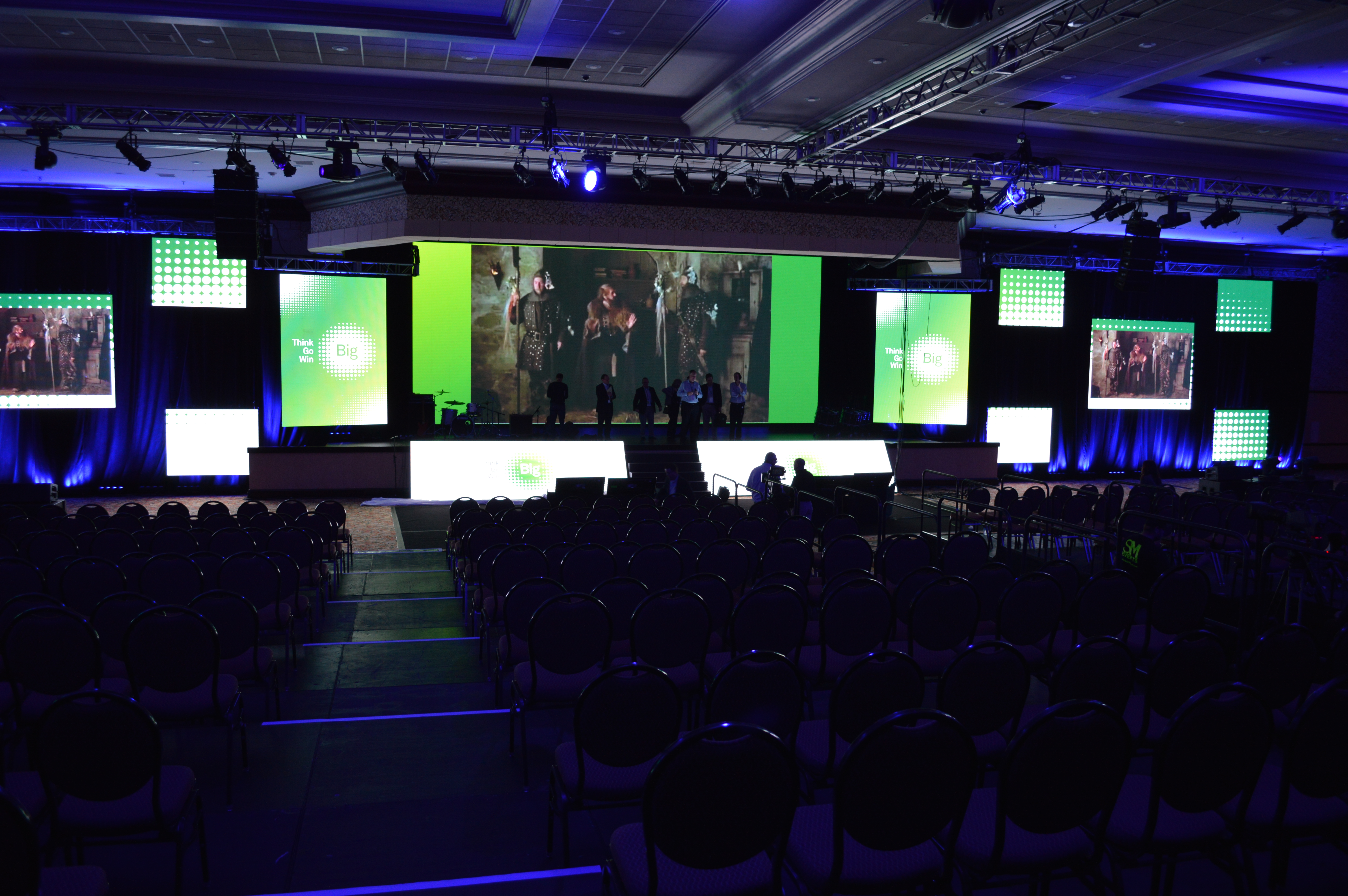 This is a multi-video wall display with a flown lighting rig and audio array. Our seated riser staging is also barely visible because it is a little dark.