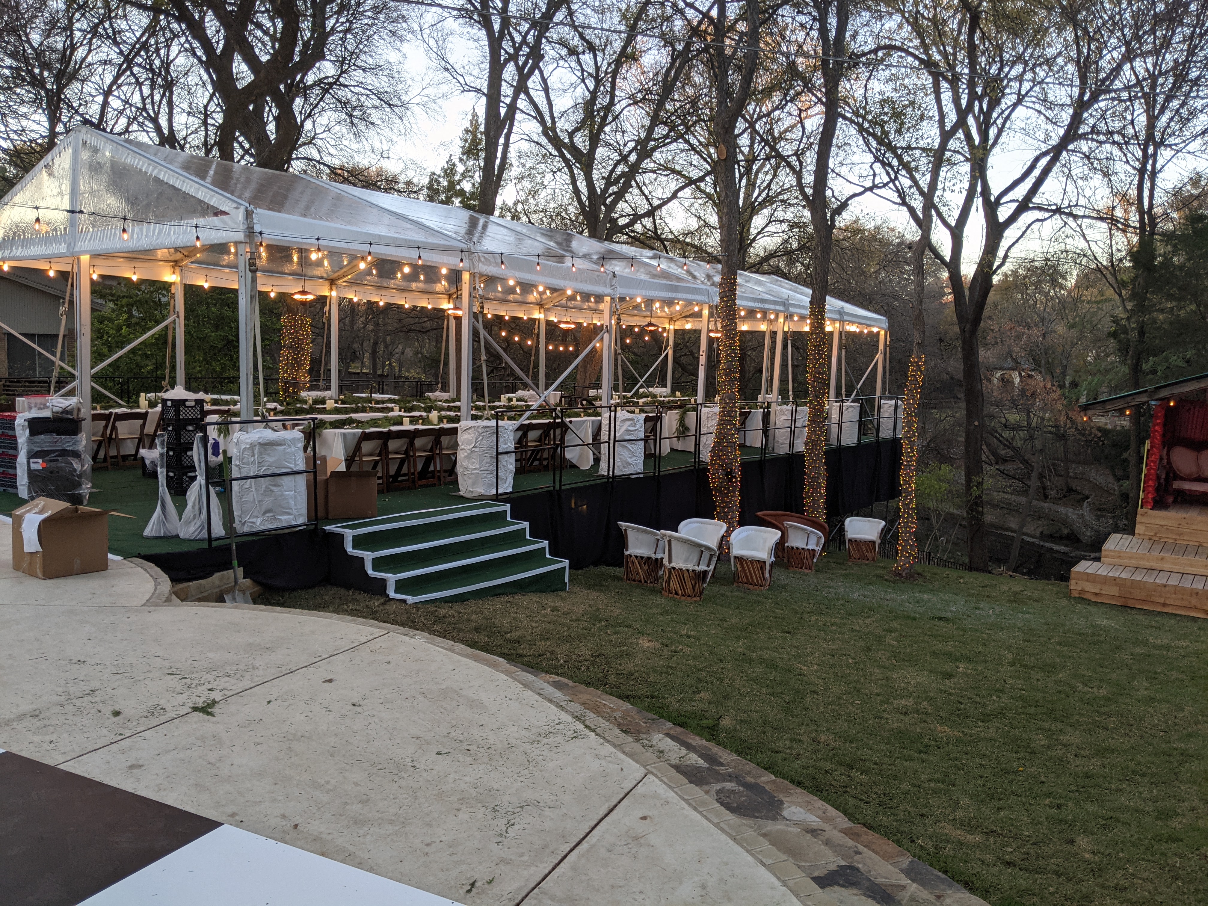 This was a fantastic wedding event where we installed a stage over a very curved and steep sloped back yard. The legs of our stage supported and stabilized the tent for our guests.